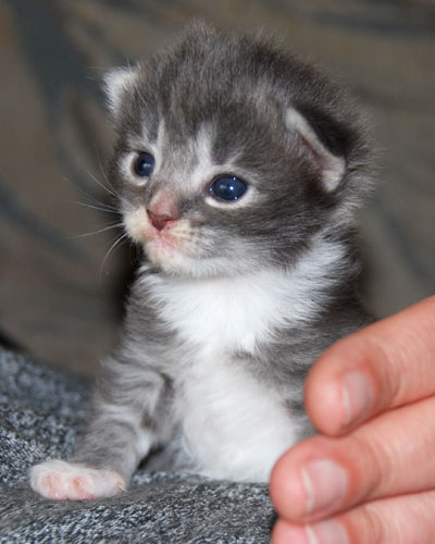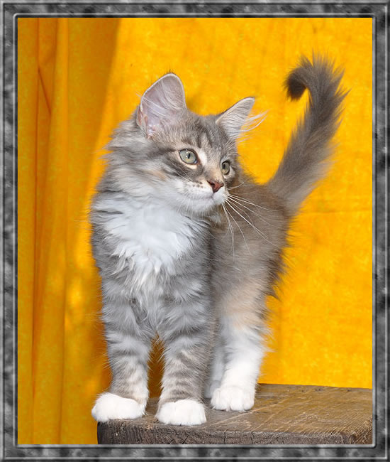Ihre Creme-Flecken, die etwas Entwicklungszeit brauchen, werden immer größer. Besonders die cremefarbenen Nackensträhnen geben dem blauen Haarkleid eine schöne Duftigkeit. Langsam entwickelt sich auch ihr Silber und lässt das Fell bei Lichteinfall von innen heraus aufleuchten.