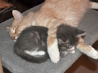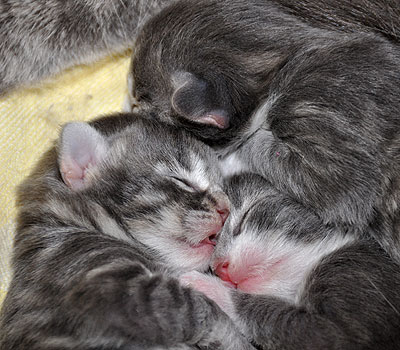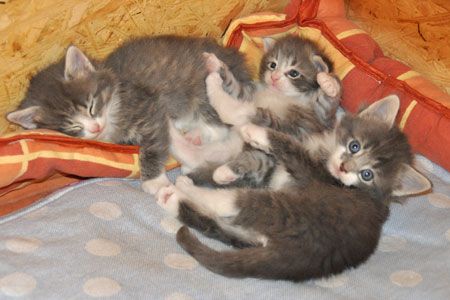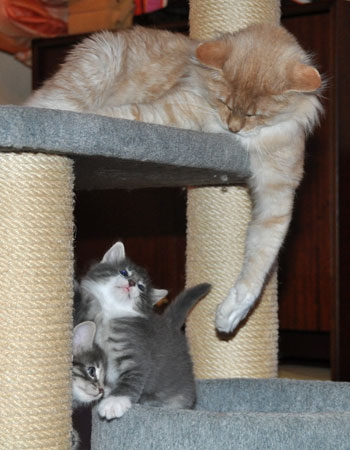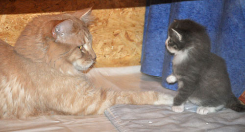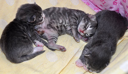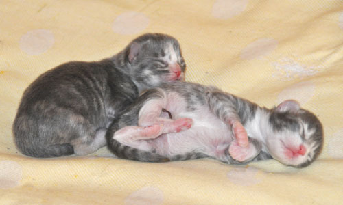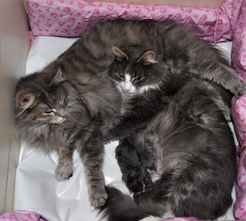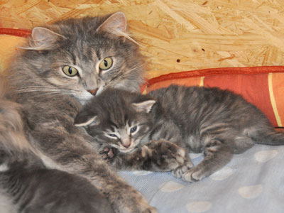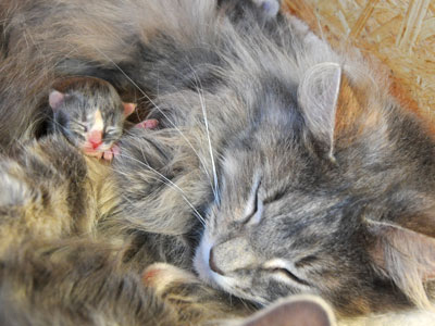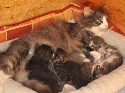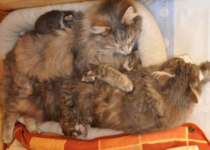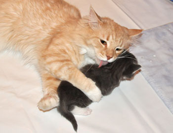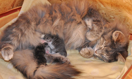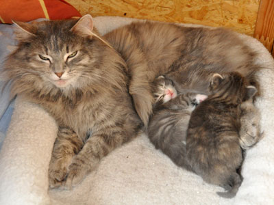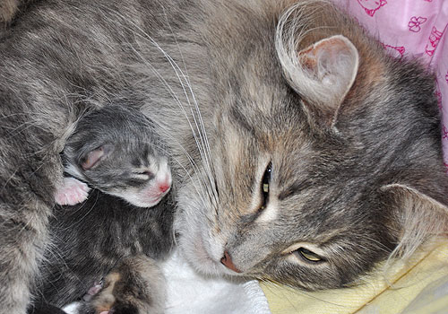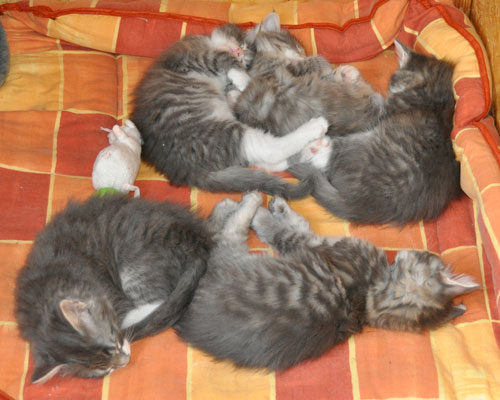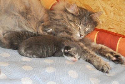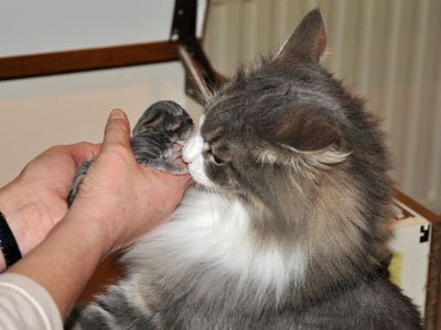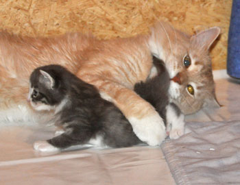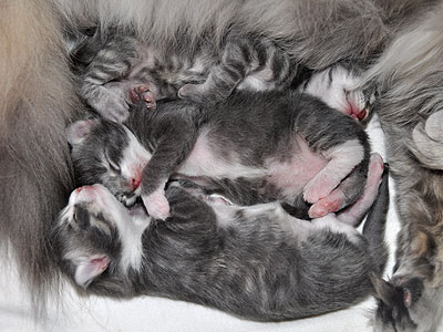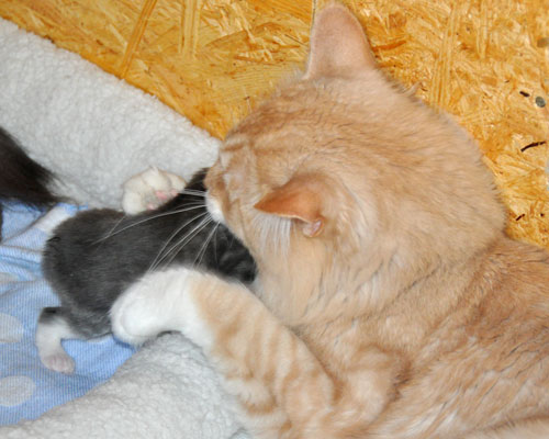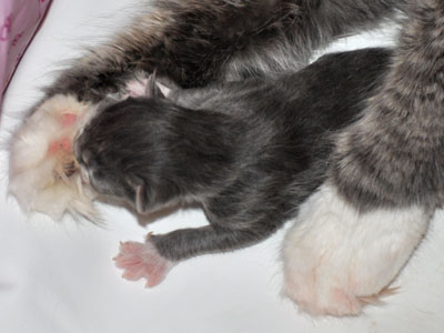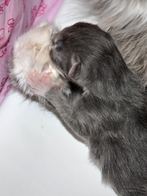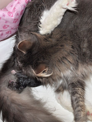 Für ihren Erstgeborenen hat Dinah eine ganz neue Form der "Handaufzucht" entwickelt. Er steckt sein Näschen gerne in die Ballen ihrer Vorderpfote und schmatzt dann ganz laut.