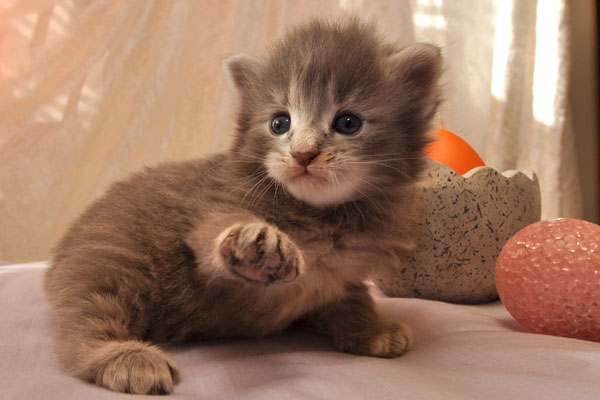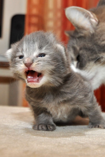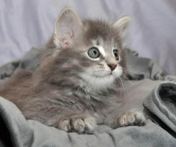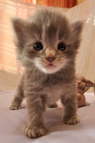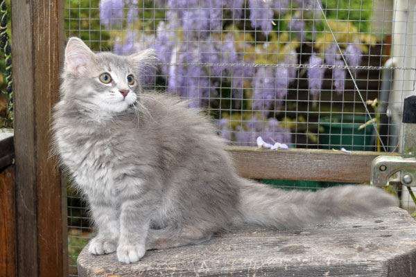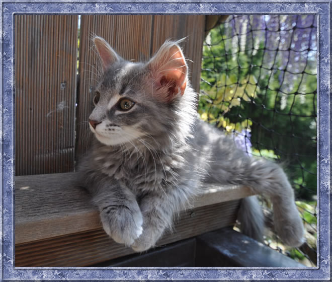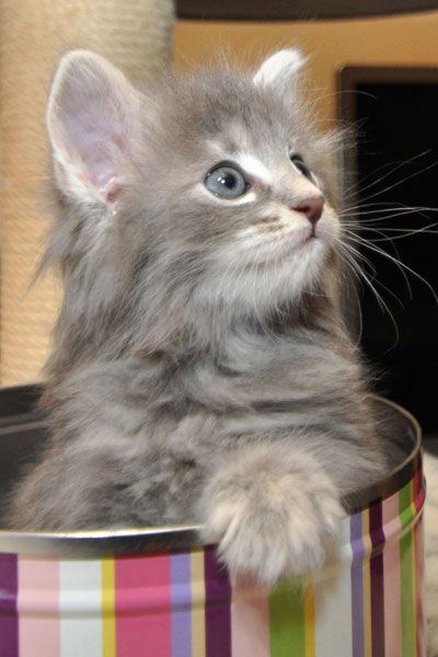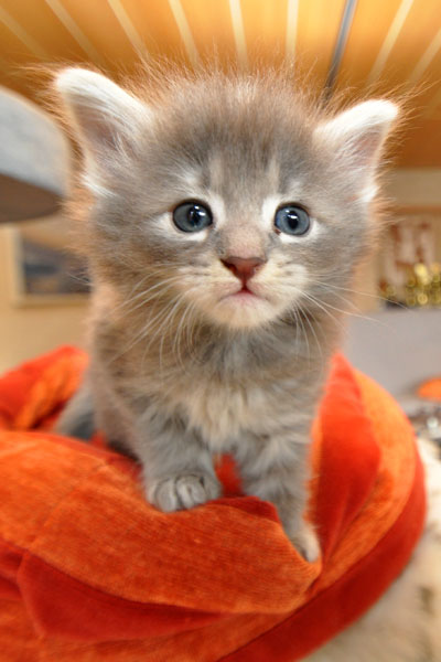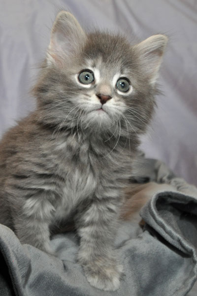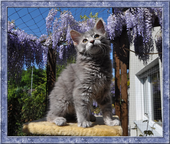 Greta hat den Model-Instinkt. Egal wie man sie fotografiert, sie sieht immer anmutig aus. Gesichtsausdruck und Körpersprache erinnern uns sehr an ihre Mutter Avinia im Kittenalter. Schließlich war das ja auch der Grund, warum Avinia damals bei uns blieb und uns mit ihrem Blick heute noch weich werden läßt. Im Moment wird Greta's blaues Kleidchen nur von wenigen kleinen Creme-Tupfern unterbrochen. Es ist aber zu vermuten, dass sich ihr Creme-Anteil ähnlich wie bei ihrer Mutter entwickeln wird.